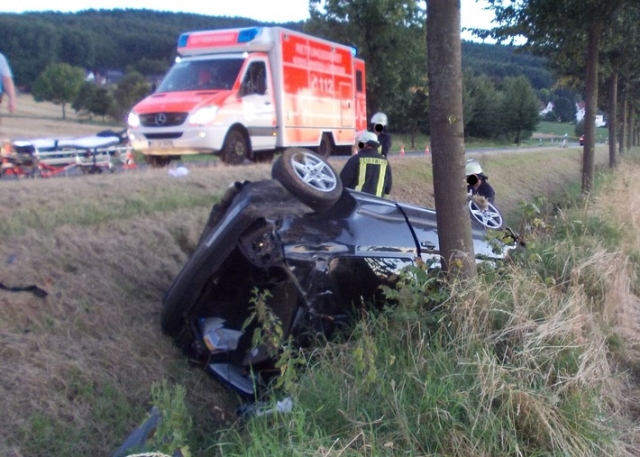 An dem Auto entstand Totalschaden. Da die Straße von vielen Bäumen gesäumt ist, hätte der Unfall auch tragischer enden können.